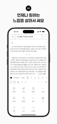 생각의 실마리를 포착하는 순간부터 완성된 작품이 세상에 나올 때까지, Typie는 작가님의 모든 여정을 함께 합니다. 글쓰기에 필요한 모든 기능을 Typie 한곳에 응축하여 오직 창작에만 몰두할 수 있는 최적의 환경을 선사합니다. Typie의 몰입형 편집기는 자간, 행간, 들여쓰기 같은 세밀한 서식 조절은 물론, 이미지, 링크, 표 등 풍부한 구성 요소로 당신의 아이디어를 생생하게 구현합니다. 타자기 모드와 줄 강조 기능으로 시선을 고정하고, 다크 모드로 눈의 피로를 덜어주며, 자주 쓰는 문장 부호는 똑똑하게 자동 변환됩니다. 외부 키보드 사용자에게도 익숙하고 쾌적한 편집 경험을 제공하여, 당신의 글쓰기 흐름이 끊기지 않도록 지원합니다.