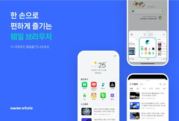 네이버 웨일 브라우저는 쉽고 빠른 웹 탐색을 제공합니다. 모든 기기에서 매끄러운 동기화를 경험하고, 쾌적한 환경에서 악성 광고 없이 콘텐츠를 즐겨보세요. 스마트한 브라우징의 시작입니다.