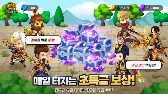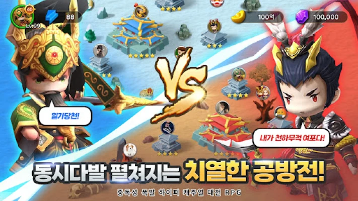 약빤삼국에서는 다채로운 삼국 영웅들을 수집하여 자신만의 독특한 전술을 완성할 수 있습니다. 각 장수들의 조합에 따라 폭발적인 시너지가 발휘되며, 이를 통해 서버를 제패할 강력한 덱을 구축하세요. 메인 전투, 스릴 넘치는 보스전, 약탈전은 물론, 길드 클럽 대전까지 숨 막히는 콘텐츠들이 끊임없이 펼쳐집니다. 삼국 지하 던전, 시련의 탑, 보물 광산 등 상상을 초월하는 미친 재미가 가득하며, 손오공, 저팔계, 사오정, 삼장법사 같은 개성 넘치는 영웅들까지 당신의 지휘를 기다립니다.